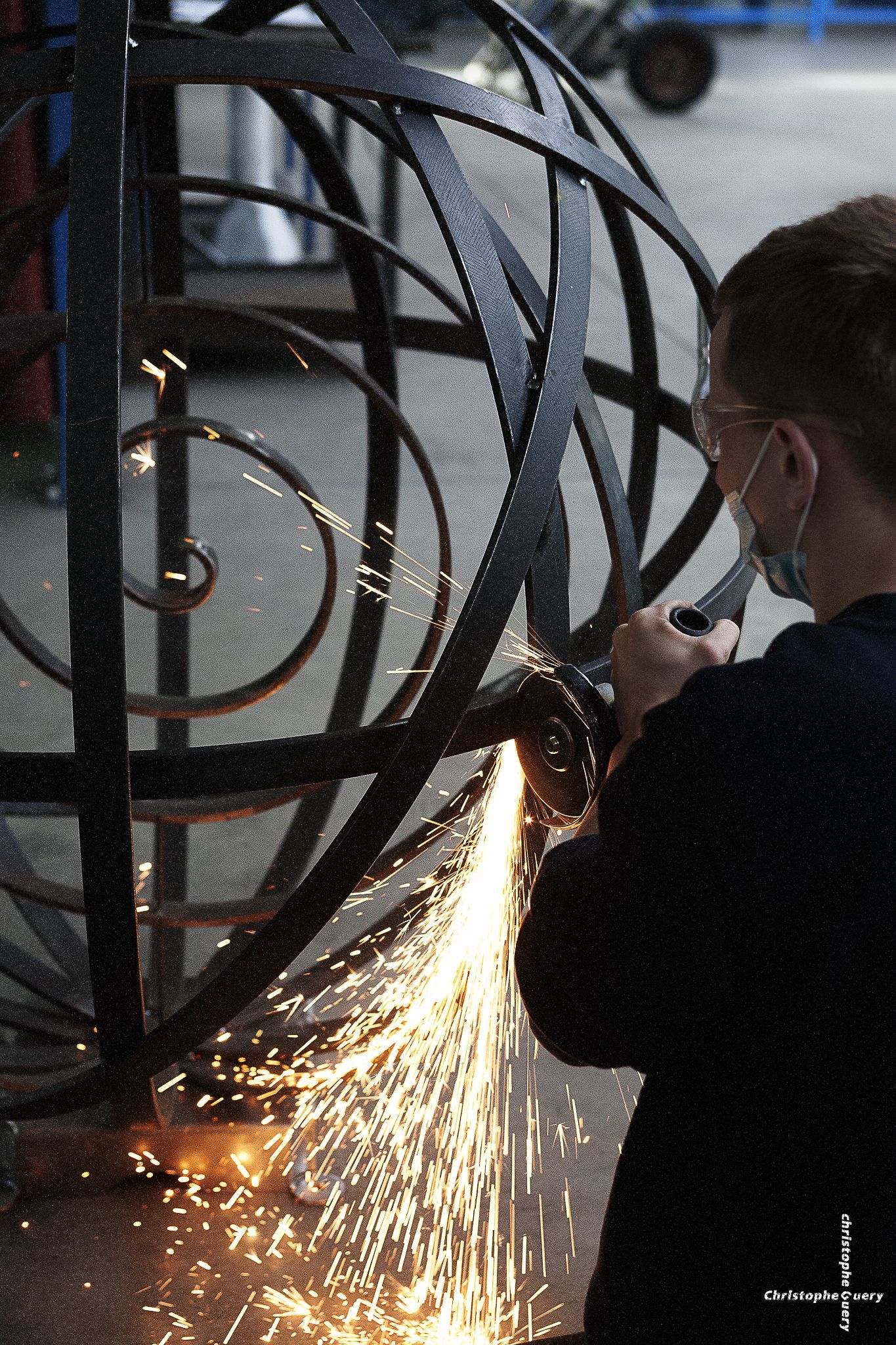 Je reçois de » l’Atelier qui regarde » une carte blanche pour suivre la réalisation d’une sculpture : une sphère en métal. Le monde du fer m’attire mais demeure très mystérieux pour moi. Comment ces longueurs de métal deviendront-elles une sculpture sphérique ? Ma fascination pour le cercle, le rond, la spirale…